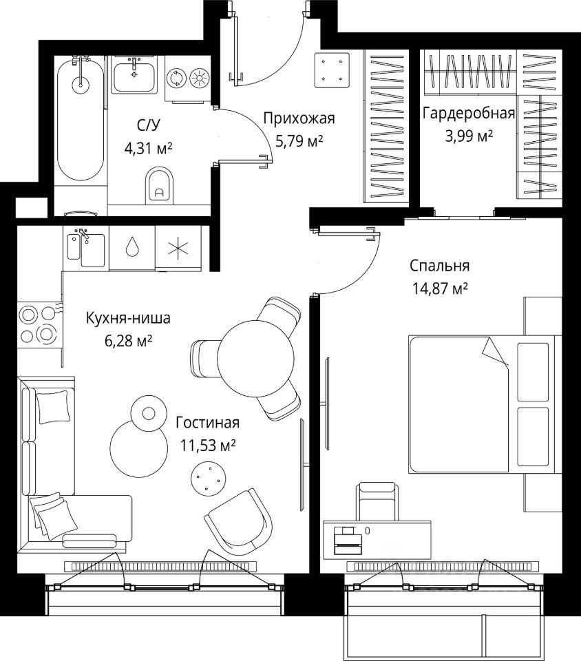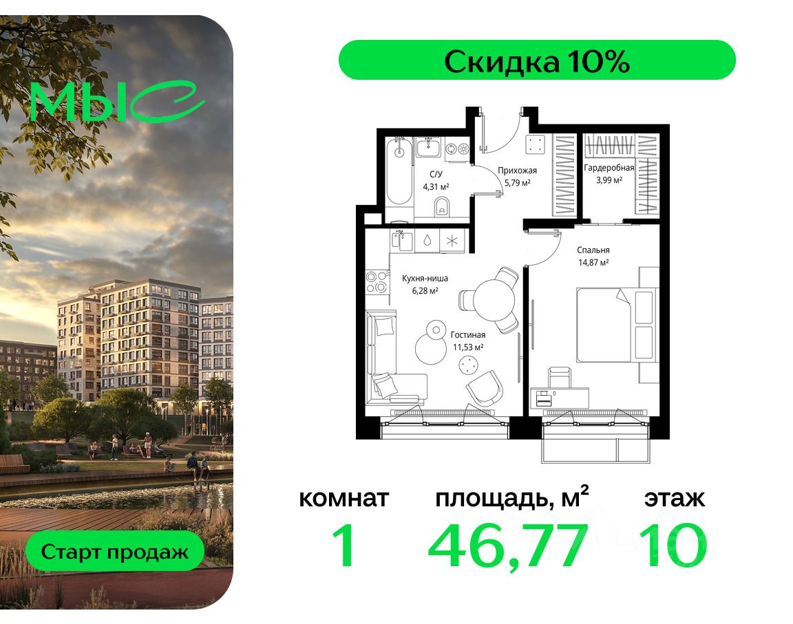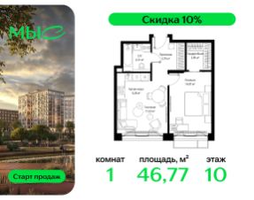 Продаётся 1-комнатная квартира общей площадью 46.77 м² без отделки в премиальном жилом комплексе "МЫС" на 10-м этаже 12 этажного дома. Квартира расположена в корпусе "Волга".