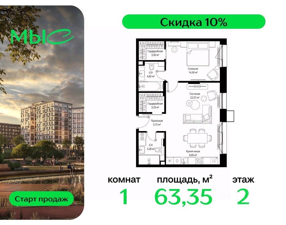 Продаётся 1-комнатная квартира общей площадью 63.35 м² без отделки в премиальном жилом комплексе "МЫС" на 2-м этаже 12 этажного дома. Квартира расположена в корпусе "Волга".