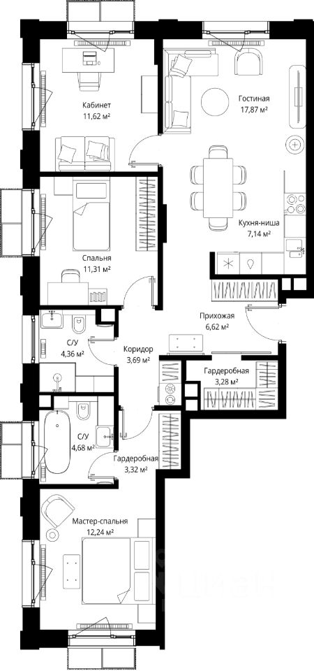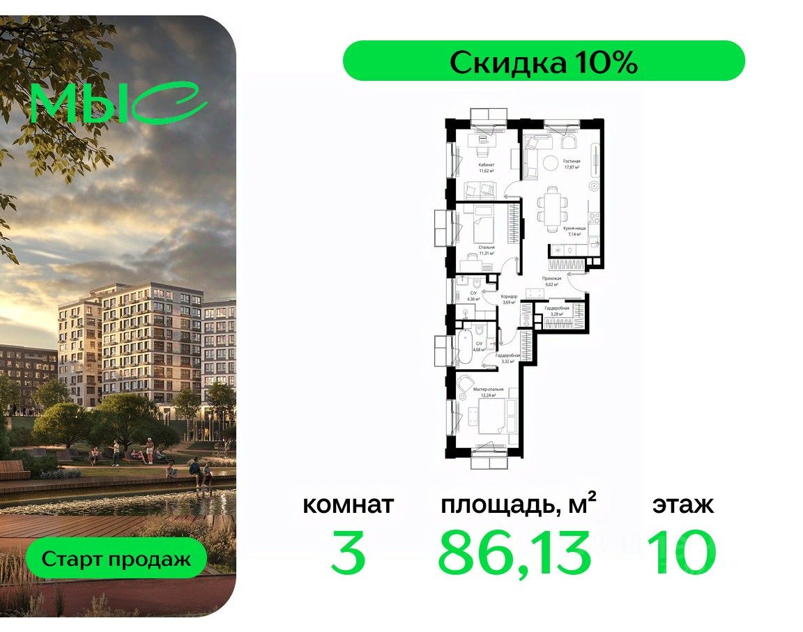 Продаётся 3-комнатная квартира общей площадью 86.13 м² без отделки в премиальном жилом комплексе "МЫС" на 10-м этаже 12 этажного дома. Квартира расположена в корпусе "Волга".