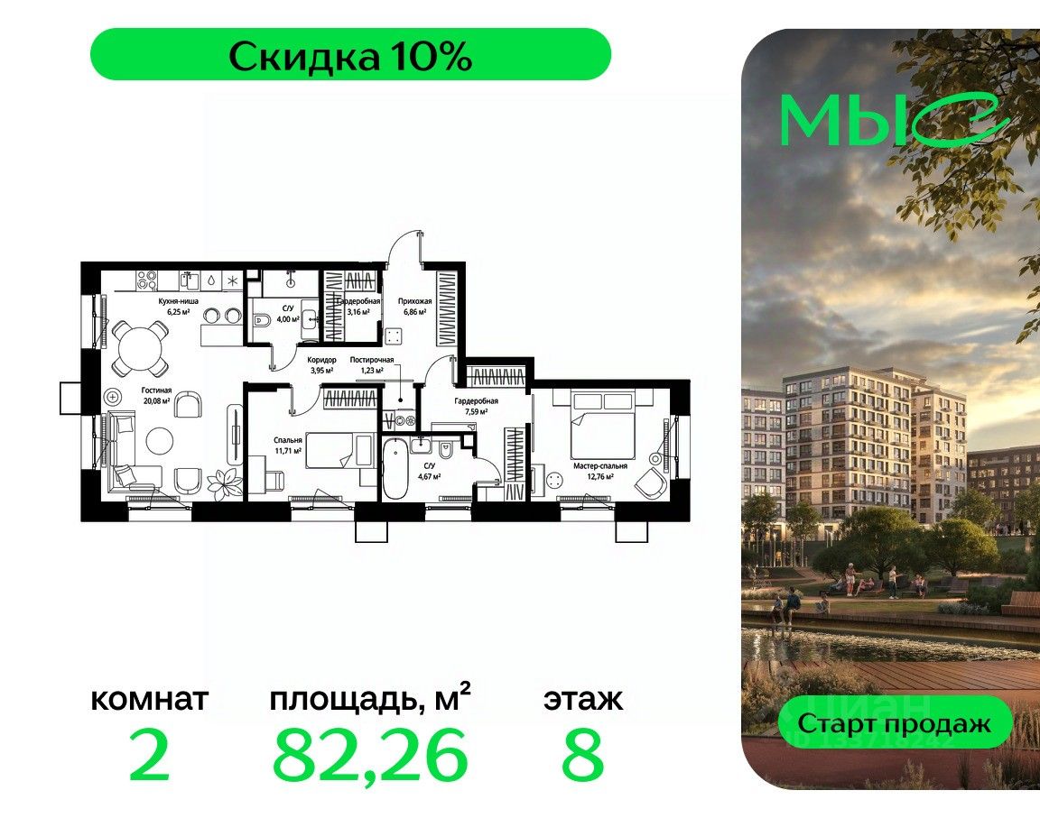 Продаётся 2-к квартира общей площадью 82.26 м² без отделки в премиальном жилом комплексе "МЫС" на 8-м этаже 12 этажного дома. Квартира расположена в корпусе "Волга".