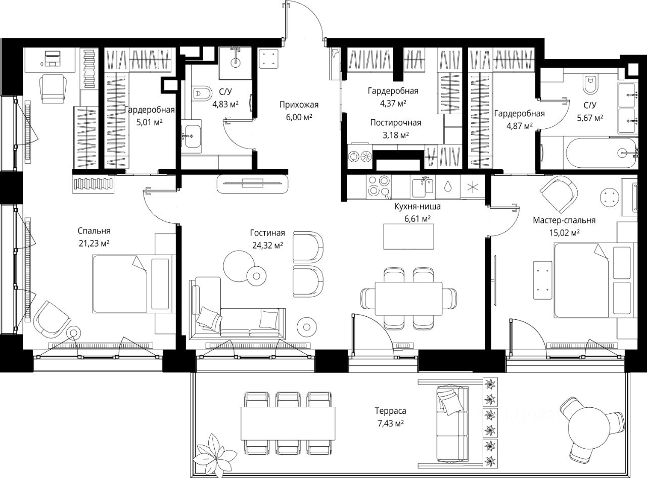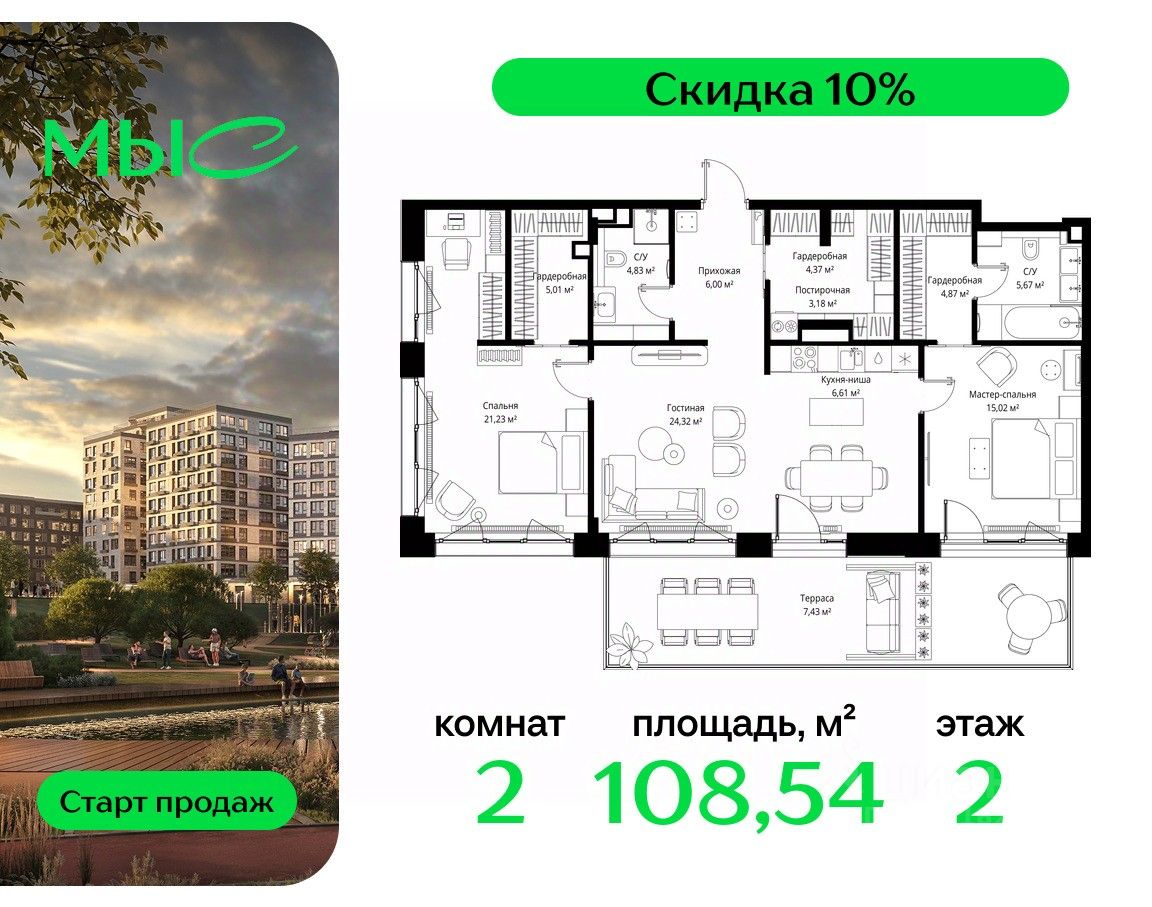 Продаётся 2-комнатная квартира общей площадью 108.54 м² без отделки в премиальном жилом комплексе "МЫС" на 2-м этаже 12 этажного дома. Квартира расположена в корпусе "Волга".