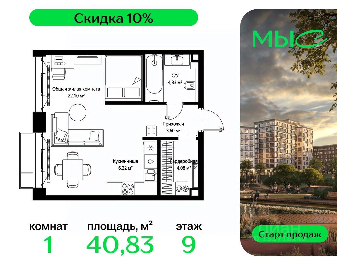 Продаётся 1-к квартира общей площадью 40.83 м² без отделки в премиальном жилом комплексе "МЫС" на 9-м этаже 12 этажного дома. Квартира расположена в корпусе "Волга".