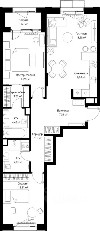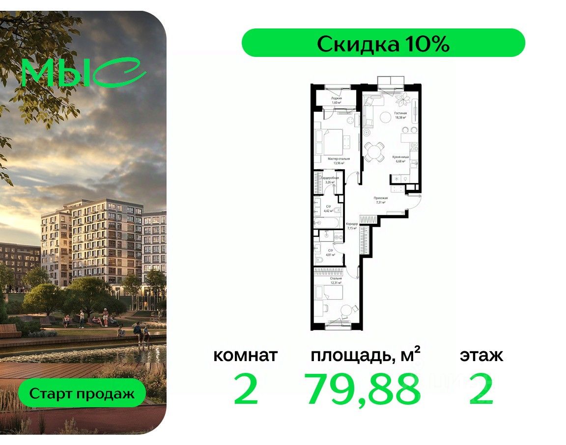 Продаётся 2-комнатная квартира общей площадью 79.88 м² без отделки в премиальном жилом комплексе "МЫС" на 2-м этаже 12 этажного дома. Квартира расположена в корпусе "Волга".