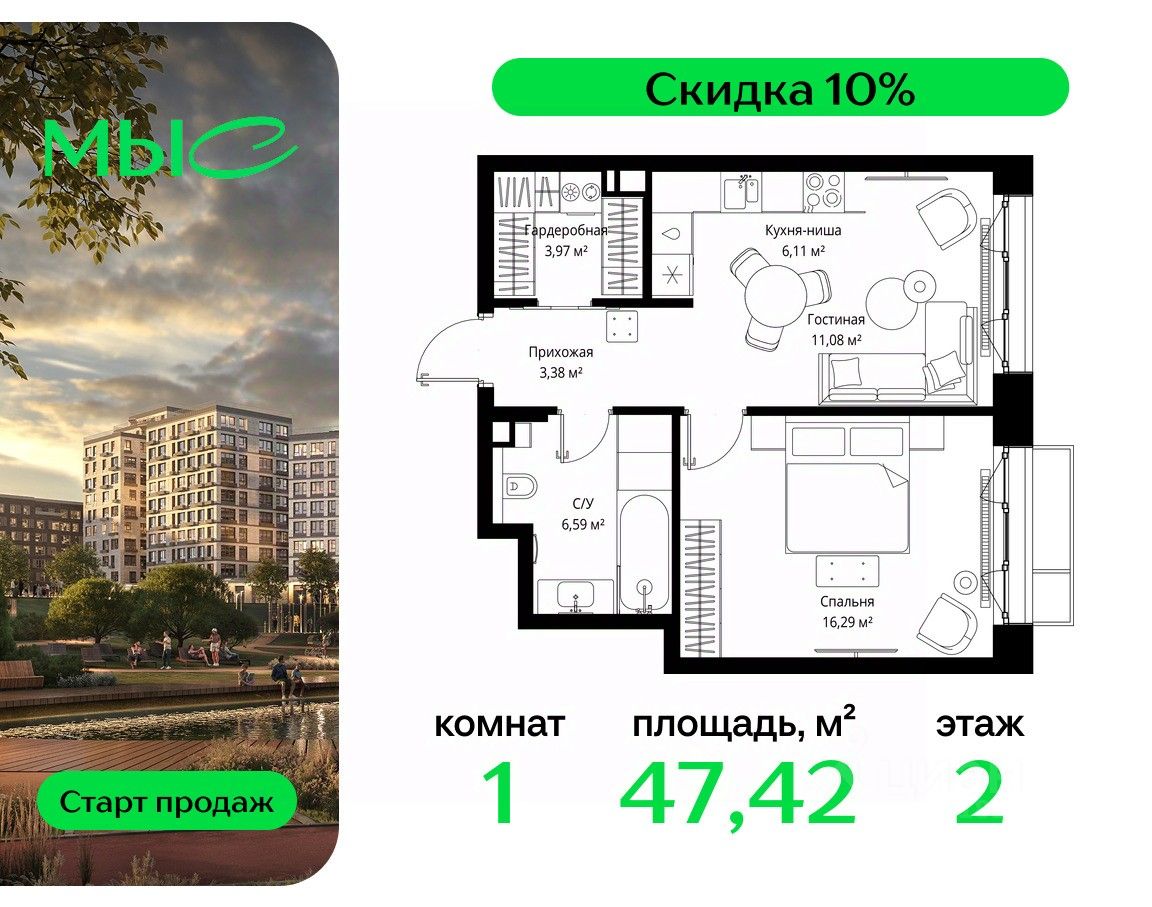 Продаётся 1-комнатная квартира общей площадью 47.42 м² без отделки в премиальном жилом комплексе "МЫС" на 2-м этаже 12 этажного дома. Квартира расположена в корпусе "Волга".