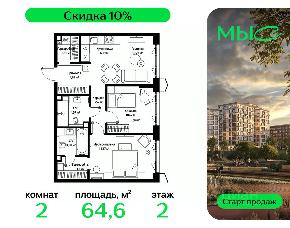 Продаётся 2-к квартира общей площадью 64.60 м² без отделки в премиальном жилом комплексе "МЫС" на 2-м этаже 12 этажного дома. Квартира расположена в корпусе "Сибирь".