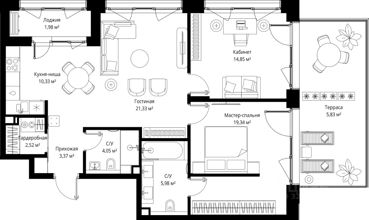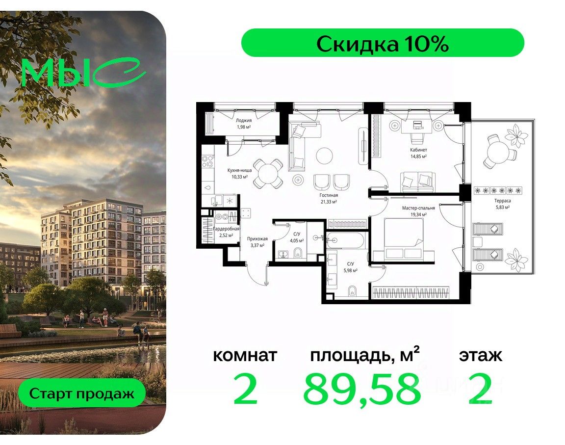 Продаётся 2-комнатная квартира общей площадью 89.58 м² без отделки в премиальном жилом комплексе "МЫС" на 2-м этаже 12 этажного дома. Квартира расположена в корпусе "Сибирь".