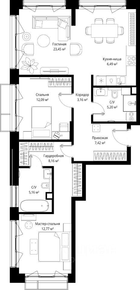 Продаётся 2-комнатная квартира общей площадью 83.90 м² без отделки в премиальном жилом комплексе "МЫС" на 4-м этаже 12 этажного дома. Квартира расположена в корпусе "Сибирь".