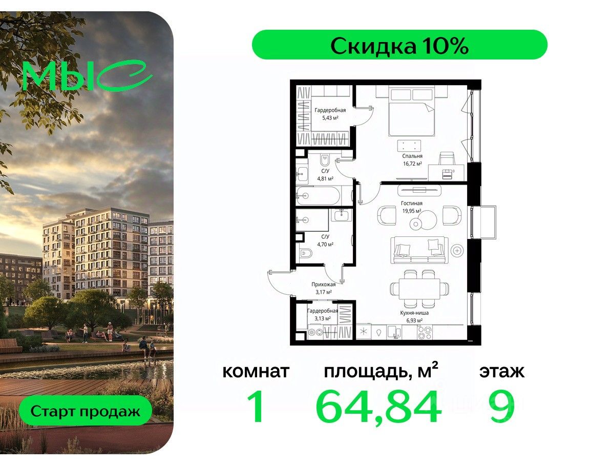 Продаётся 1-комнатная квартира общей площадью 64.84 м² без отделки в премиальном жилом комплексе "МЫС" на 9-м этаже 12 этажного дома. Квартира расположена в корпусе "Сибирь".