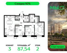 Продаётся 3-к квартира общей площадью 87.54 м² без отделки в премиальном жилом комплексе "МЫС" на 2-м этаже 12 этажного дома. Квартира расположена в корпусе "Сибирь".
