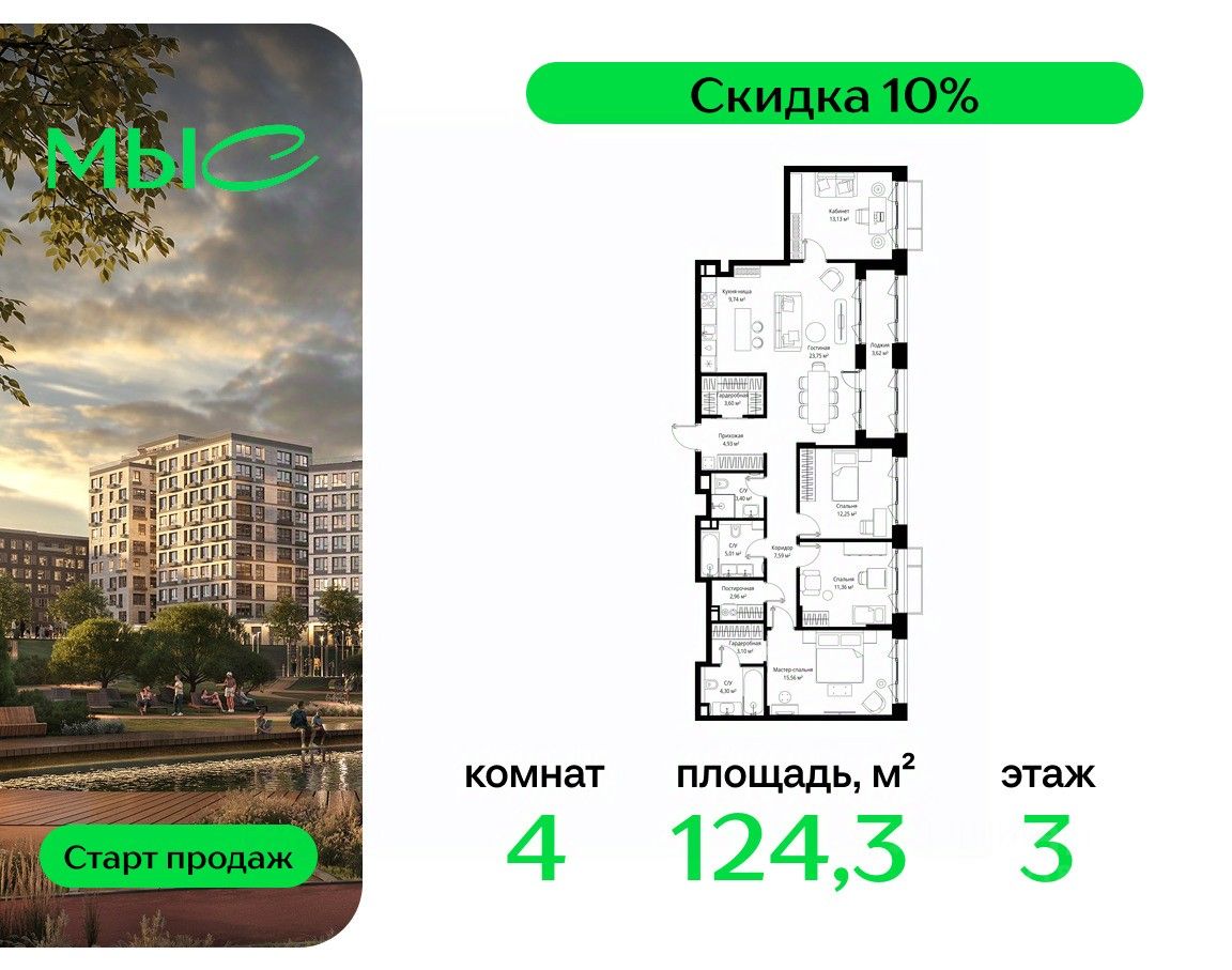 Продаётся 4-комнатная квартира общей площадью 124.30 м² без отделки в премиальном жилом комплексе "МЫС" на 3-м этаже 12 этажного дома. Квартира расположена в корпусе "Сибирь".