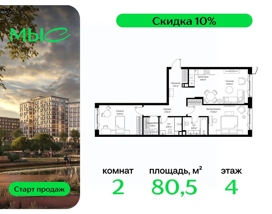 Продаётся 2-комнатная квартира общей площадью 80.50 м² без отделки в премиальном жилом комплексе "МЫС" на 4-м этаже 12 этажного дома. Квартира расположена в корпусе "Сибирь".