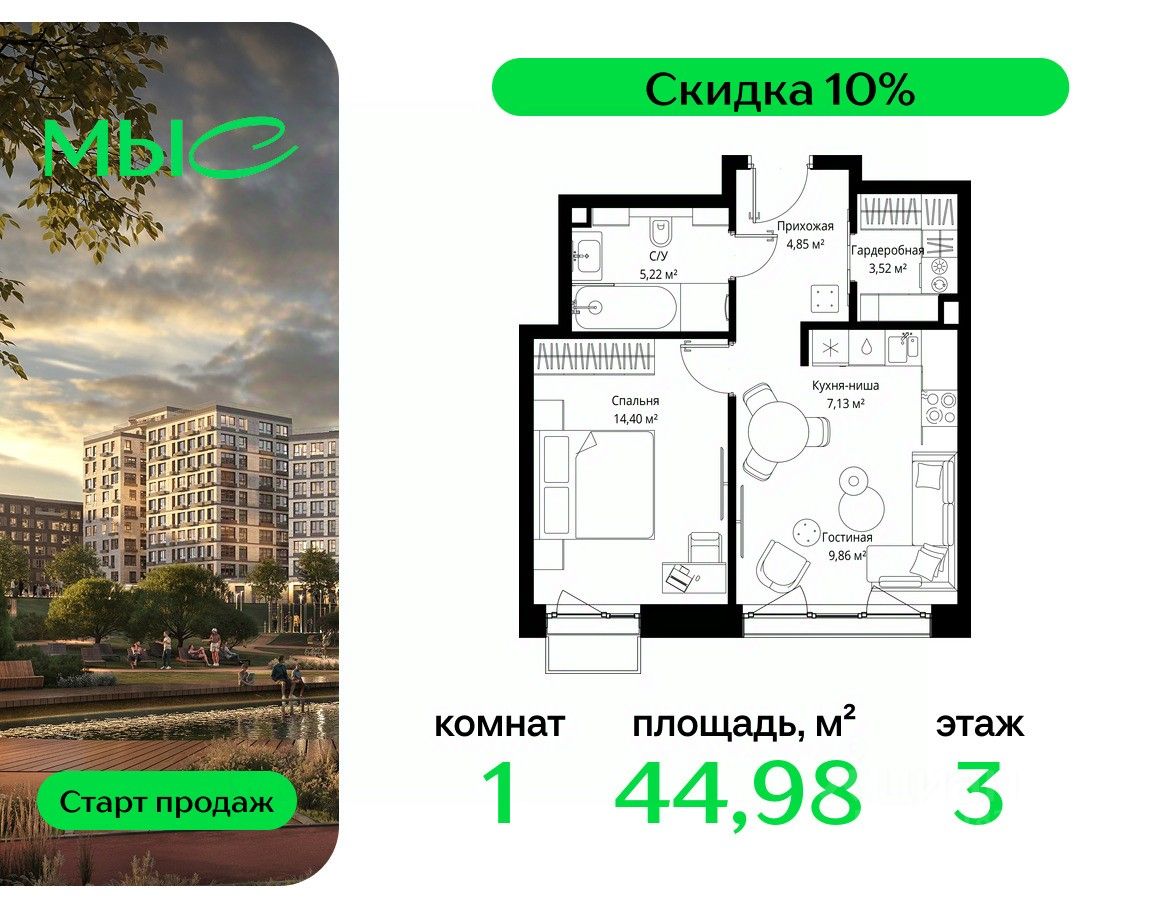 Продаётся 1-комнатная квартира общей площадью 44.98 м² без отделки в премиальном жилом комплексе "МЫС" на 3-м этаже 12 этажного дома. Квартира расположена в корпусе "Сибирь".