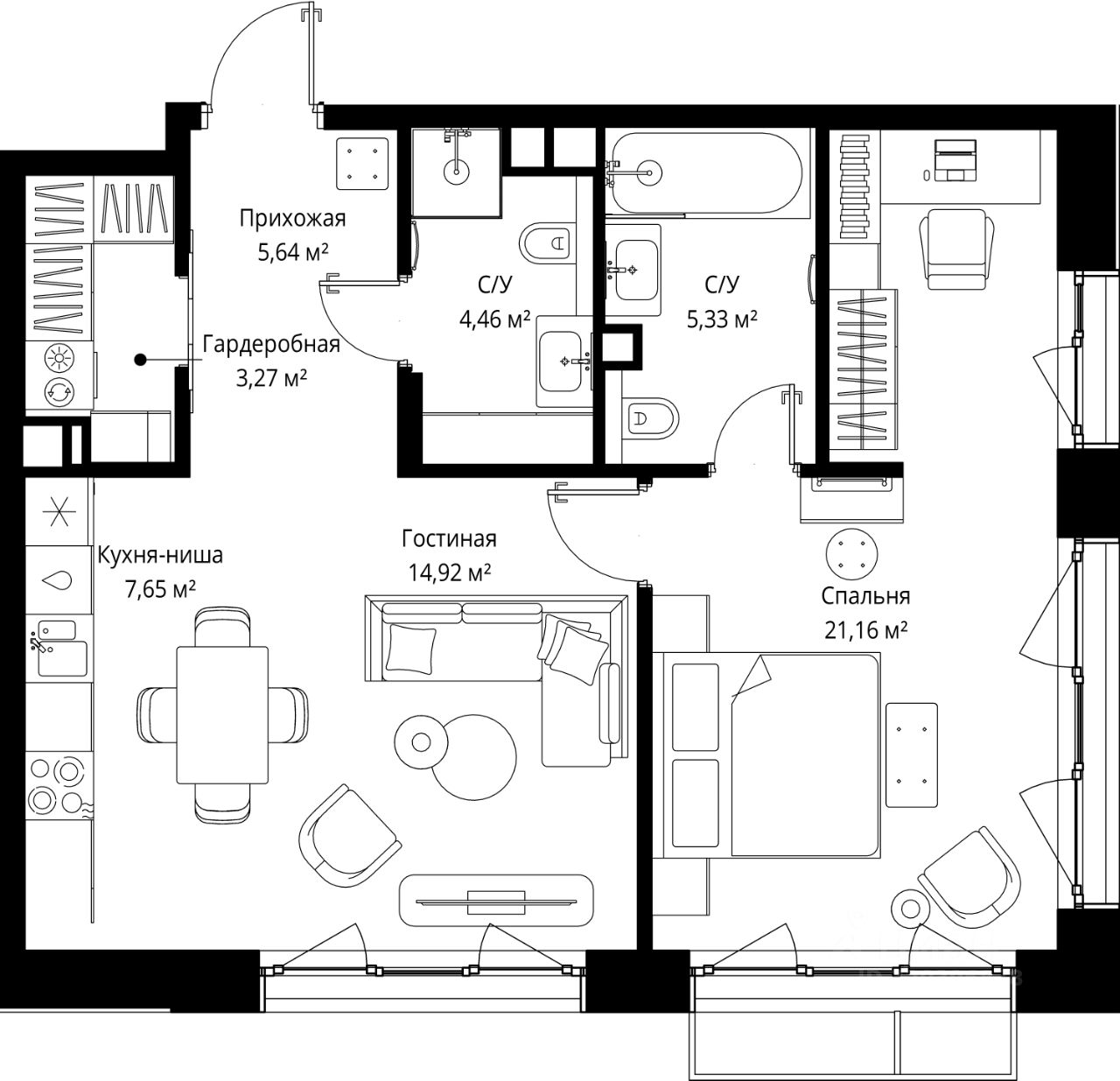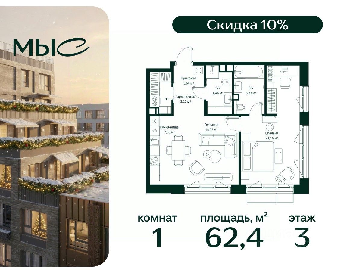 Продаётся 1-комнатная квартира общей площадью 62.43 м² без отделки в премиальном жилом комплексе "МЫС" на 3-м этаже 12 этажного дома. Квартира расположена в корпусе "Сибирь".