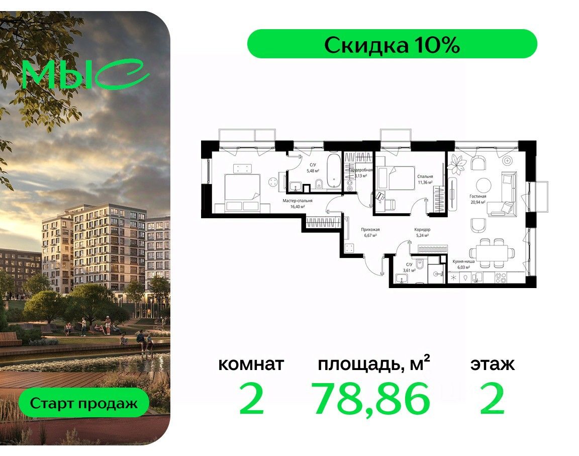 Продаётся 2-комнатная квартира общей площадью 78.86 м² без отделки в премиальном жилом комплексе "МЫС" на 2-м этаже 12 этажного дома. Квартира расположена в корпусе "Сибирь".