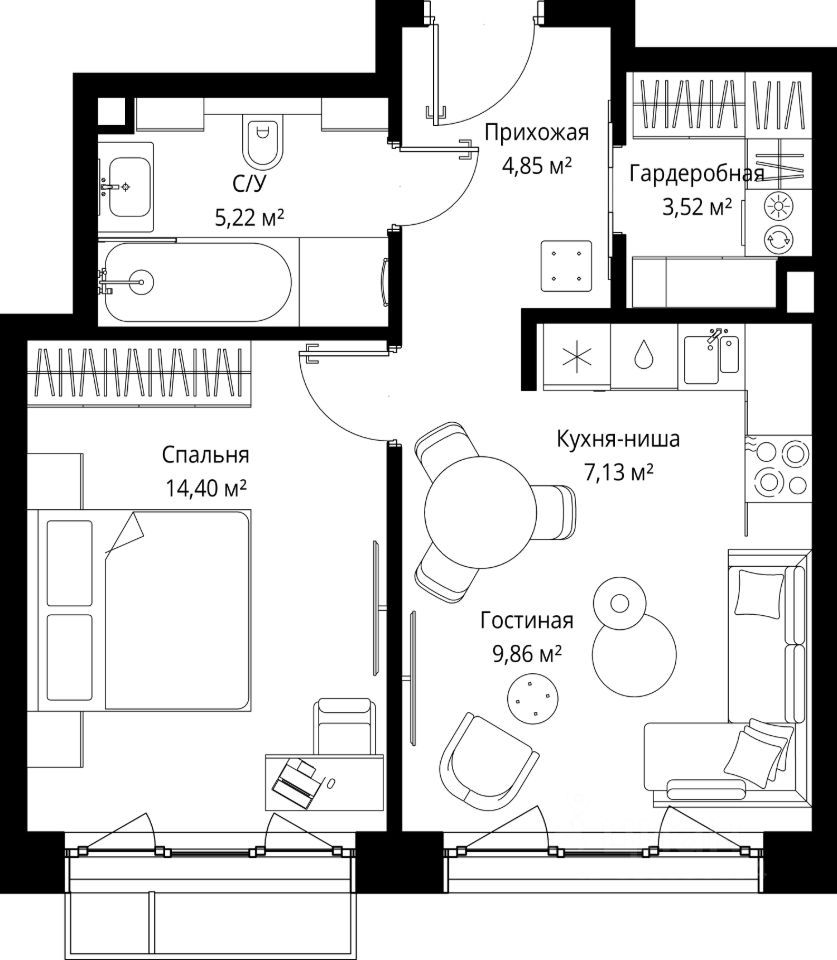 Продаётся 1-комнатная квартира общей площадью 44.98 м² без отделки в премиальном жилом комплексе "МЫС" на 3-м этаже 12 этажного дома. Квартира расположена в корпусе "Сибирь".