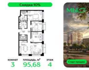 Продаётся 3-к квартира общей площадью 95.68 м² без отделки в премиальном жилом комплексе "МЫС" на 4-м этаже 12 этажного дома. Квартира расположена в корпусе "Сибирь".