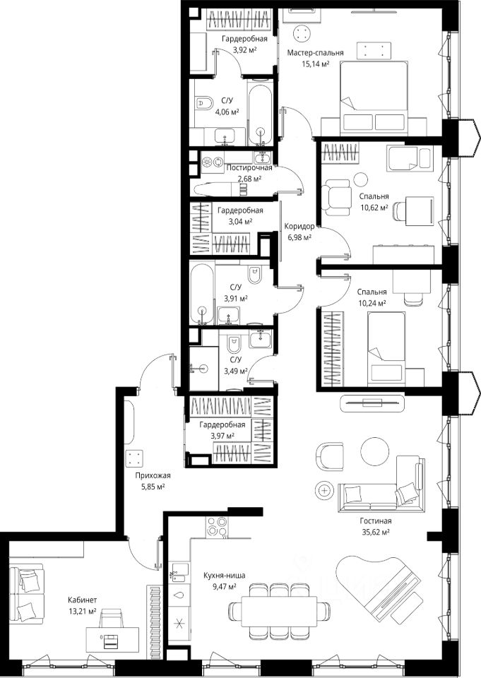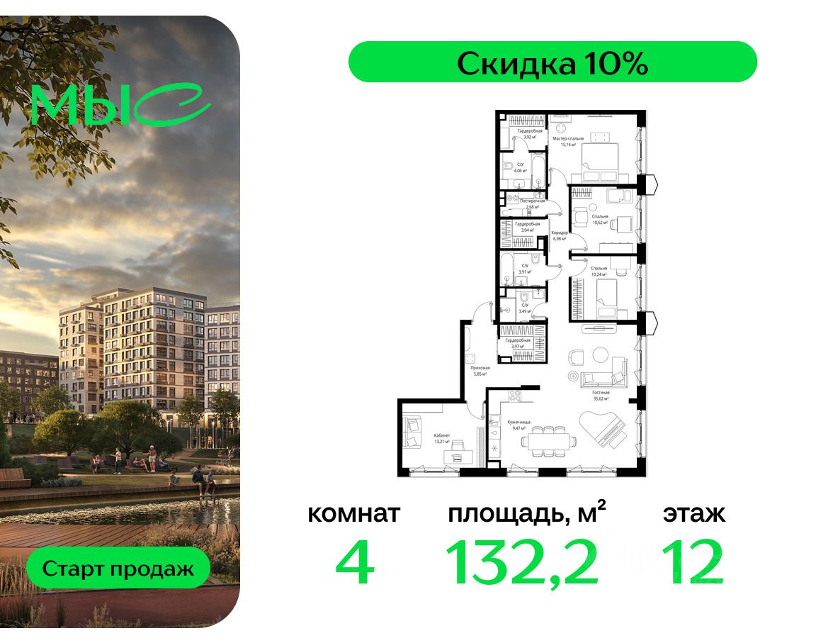 Продаётся 4-комнатная квартира общей площадью 132.20 м² без отделки в премиальном жилом комплексе "МЫС" на 12-м этаже 12 этажного дома. Квартира расположена в корпусе "Сибирь".