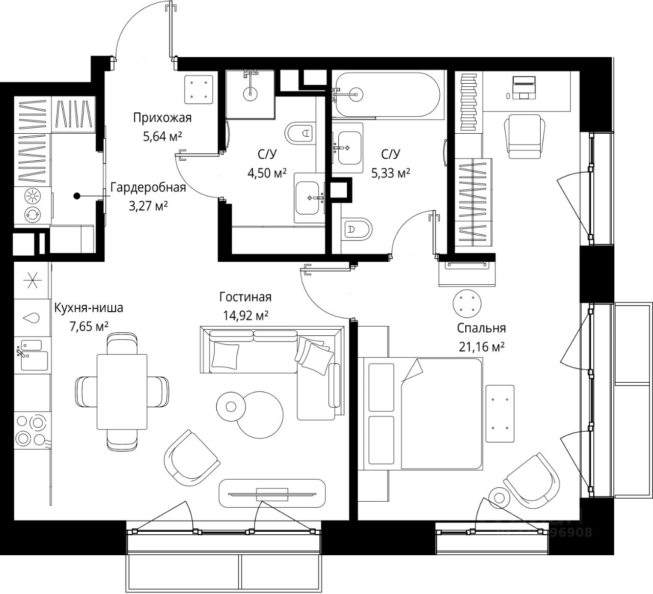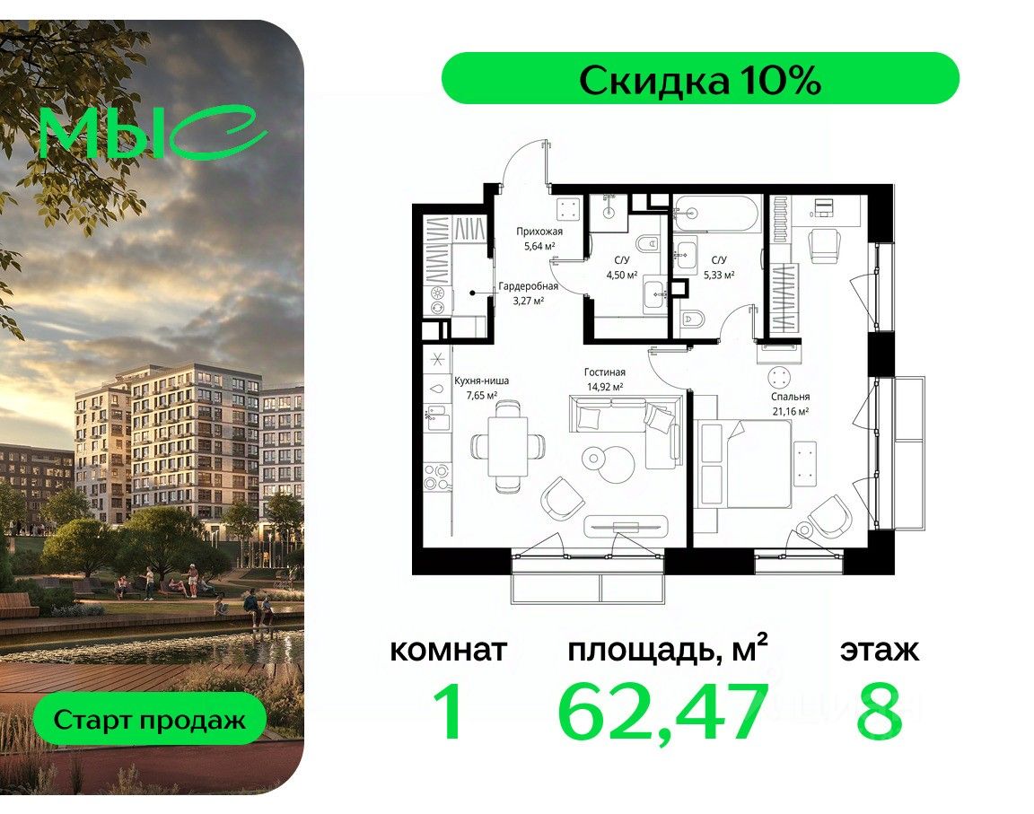 Продаётся 1-комнатная квартира общей площадью 62.47 м² без отделки в премиальном жилом комплексе "МЫС" на 8-м этаже 12 этажного дома. Квартира расположена в корпусе "Сибирь".