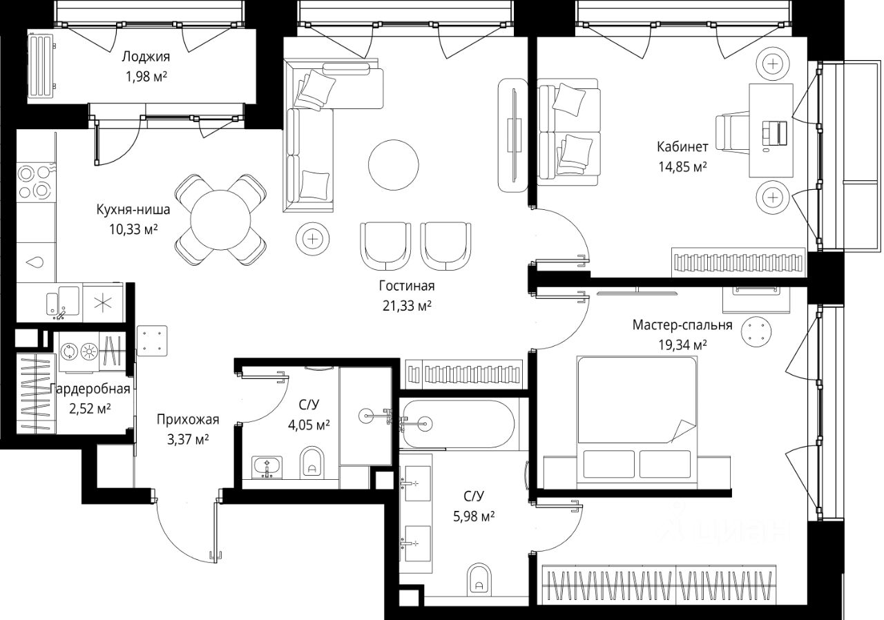 Продаётся 2-комнатная квартира общей площадью 83.75 м² без отделки в премиальном жилом комплексе "МЫС" на 7-м этаже 12 этажного дома. Квартира расположена в корпусе "Сибирь".