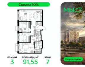 Продаётся 3-к квартира общей площадью 91.55 м² без отделки в премиальном жилом комплексе "МЫС" на 7-м этаже 12 этажного дома. Квартира расположена в корпусе "Сибирь".