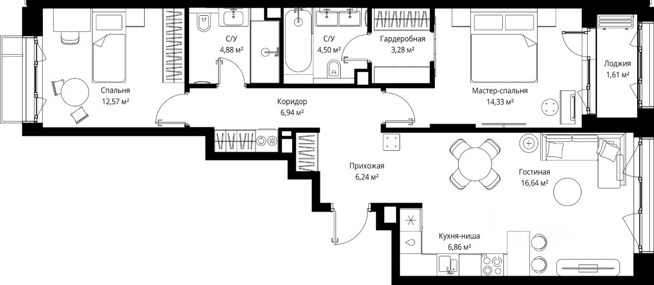 Продаётся 2-комнатная квартира общей площадью 77.85 м² без отделки в премиальном жилом комплексе "МЫС" на 3-м этаже 12 этажного дома. Квартира расположена в корпусе "Сибирь".