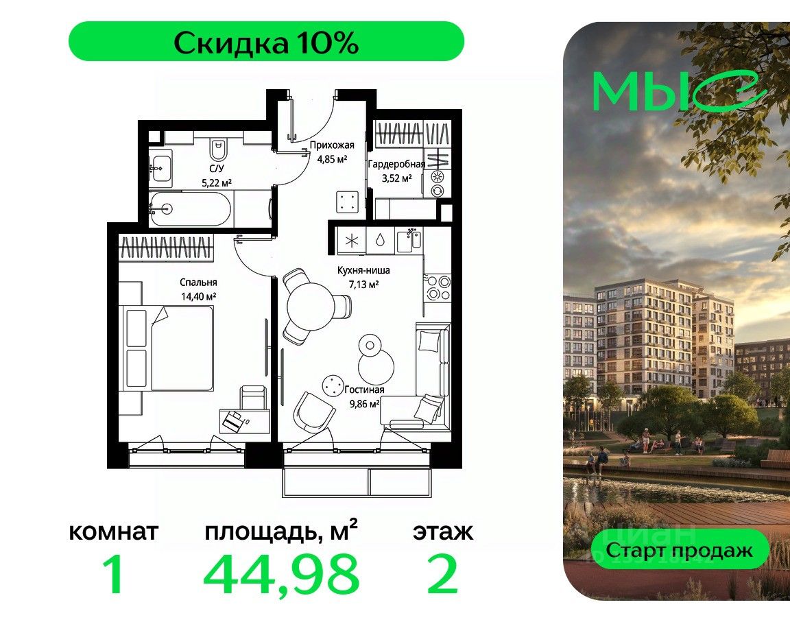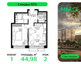 Продаётся 1-к квартира общей площадью 44.98 м² без отделки в премиальном жилом комплексе "МЫС" на 2-м этаже 12 этажного дома. Квартира расположена в корпусе "Сибирь".