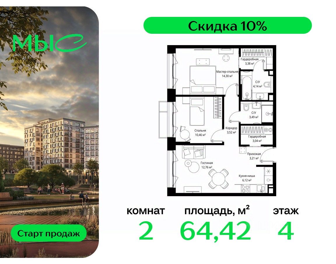 Продаётся 2-комнатная квартира общей площадью 64.42 м² без отделки в премиальном жилом комплексе "МЫС" на 4-м этаже 12 этажного дома. Квартира расположена в корпусе "Сибирь".
