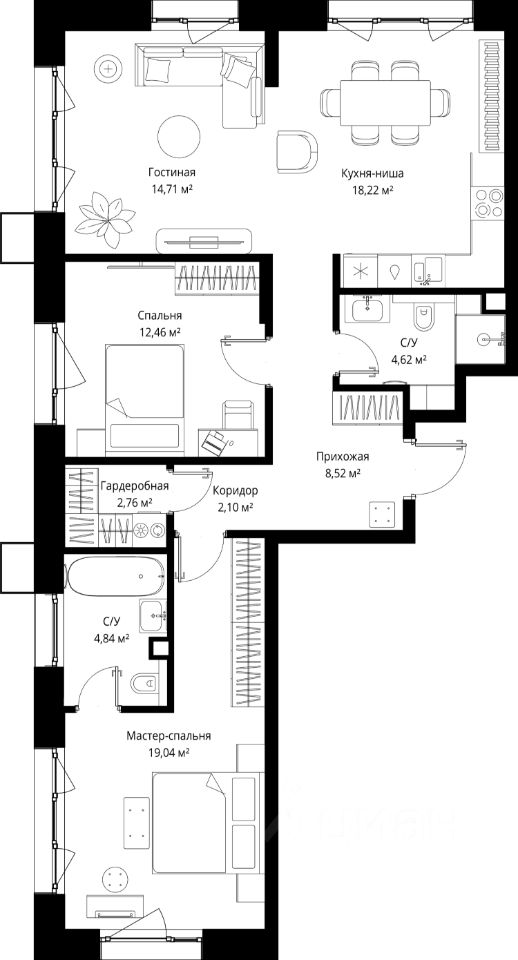 Продаётся 2-комнатная квартира общей площадью 87.27 м² без отделки в премиальном жилом комплексе "МЫС" на 6-м этаже 12 этажного дома. Квартира расположена в корпусе "Сибирь".