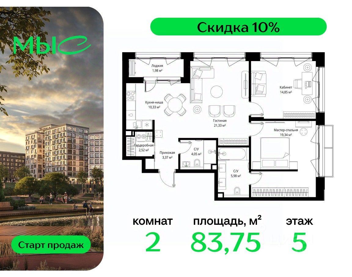 Продаётся 2-комнатная квартира общей площадью 83.75 м² без отделки в премиальном жилом комплексе "МЫС" на 5-м этаже 12 этажного дома. Квартира расположена в корпусе "Сибирь".