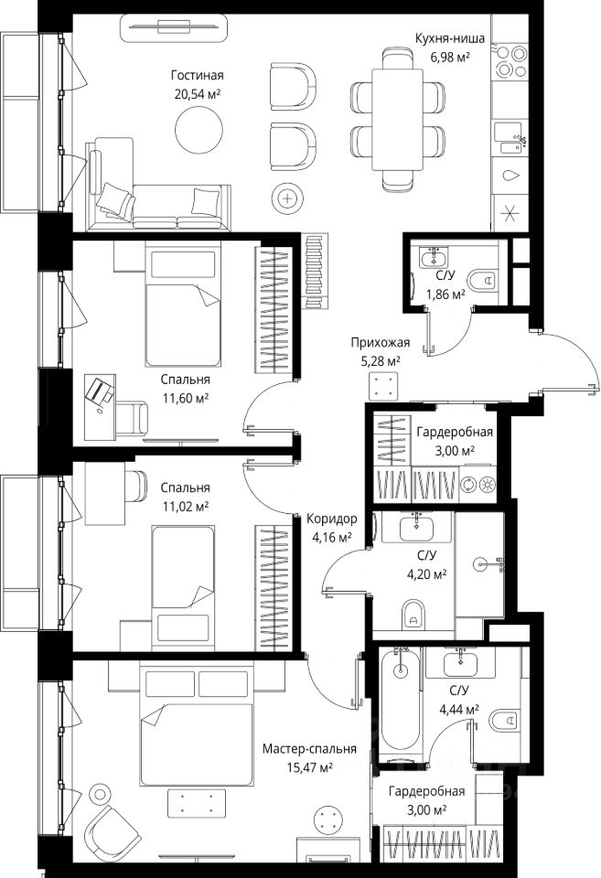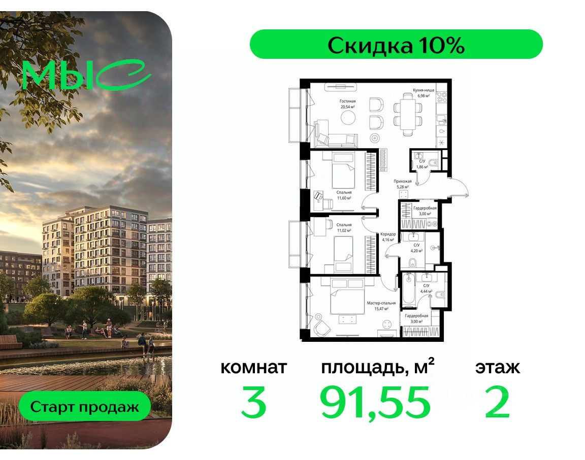 Продаётся 3-комнатная квартира общей площадью 91.55 м² без отделки в премиальном жилом комплексе "МЫС" на 2-м этаже 12 этажного дома. Квартира расположена в корпусе "Сибирь".