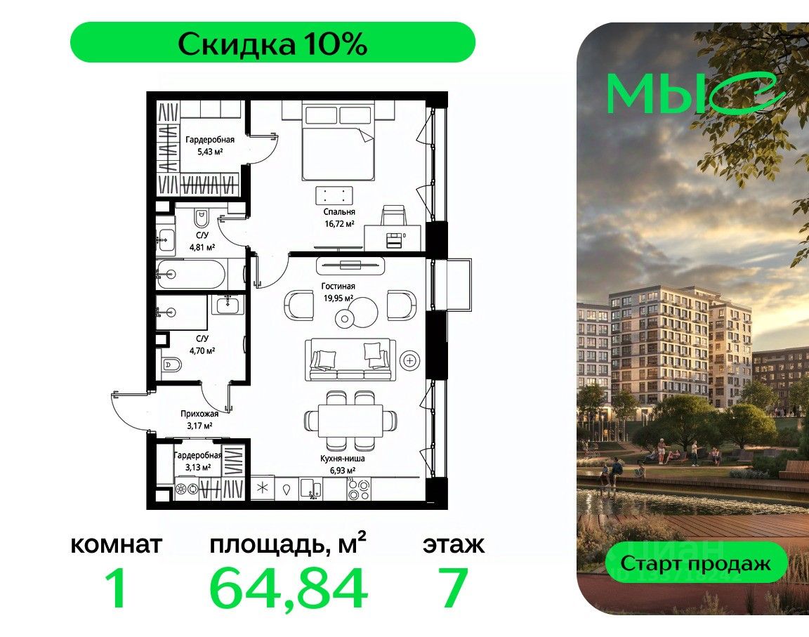 Продаётся 1-к квартира общей площадью 64.84 м² без отделки в премиальном жилом комплексе "МЫС" на 7-м этаже 12 этажного дома. Квартира расположена в корпусе "Сибирь".