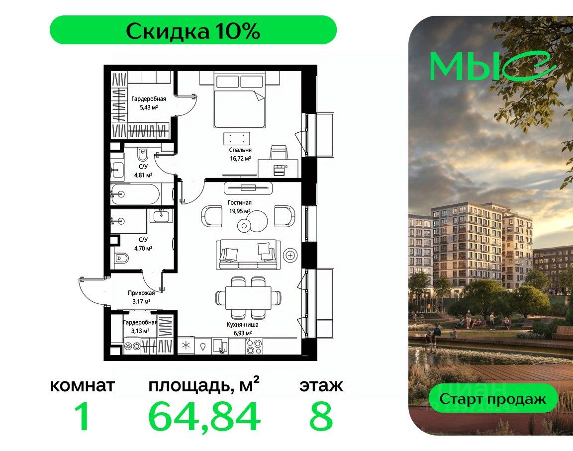 Продаётся 1-к квартира общей площадью 64.84 м² без отделки в премиальном жилом комплексе "МЫС" на 8-м этаже 12 этажного дома. Квартира расположена в корпусе "Сибирь".