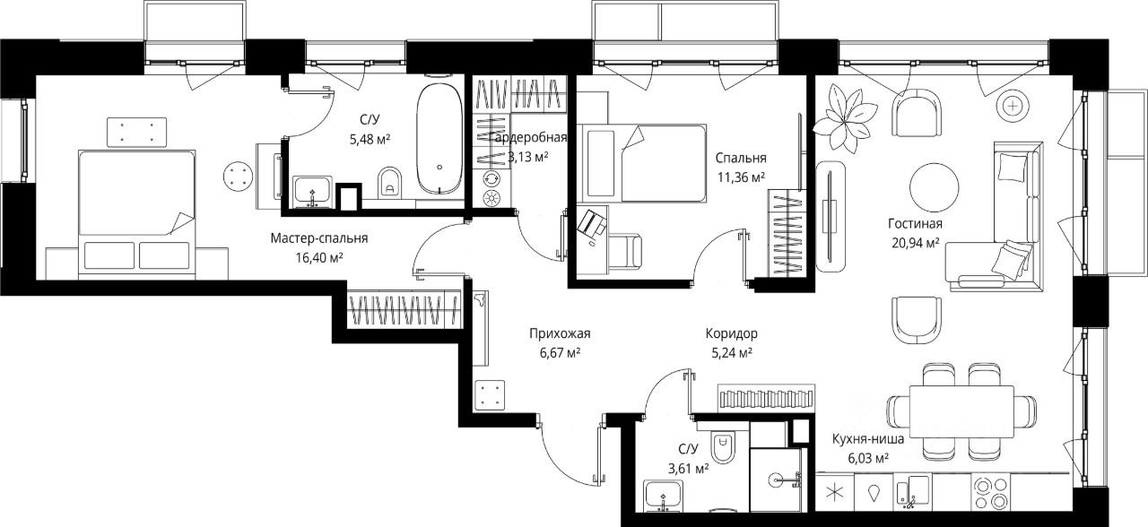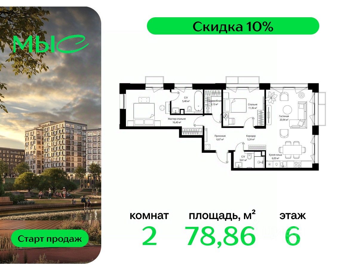 Продаётся 2-комнатная квартира общей площадью 78.86 м² без отделки в премиальном жилом комплексе "МЫС" на 6-м этаже 12 этажного дома. Квартира расположена в корпусе "Сибирь".