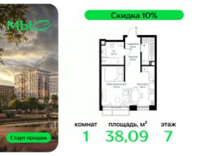 Продаётся 1-комнатная квартира общей площадью 38.09 м² без отделки в премиальном жилом комплексе "МЫС" на 7-м этаже 12 этажного дома. Квартира расположена в корпусе "Сибирь".