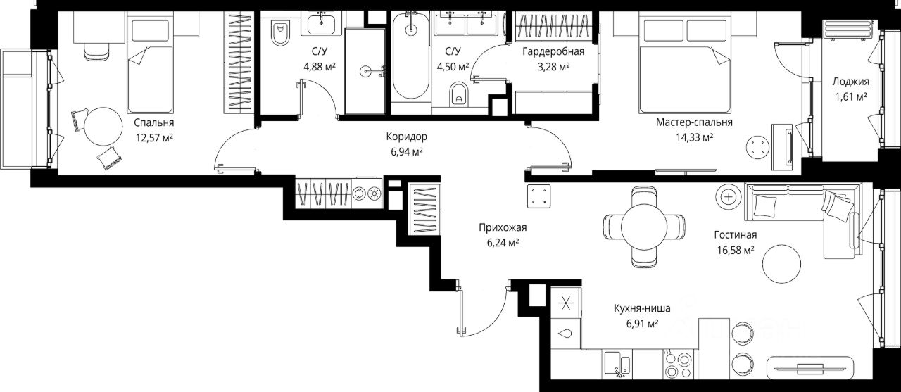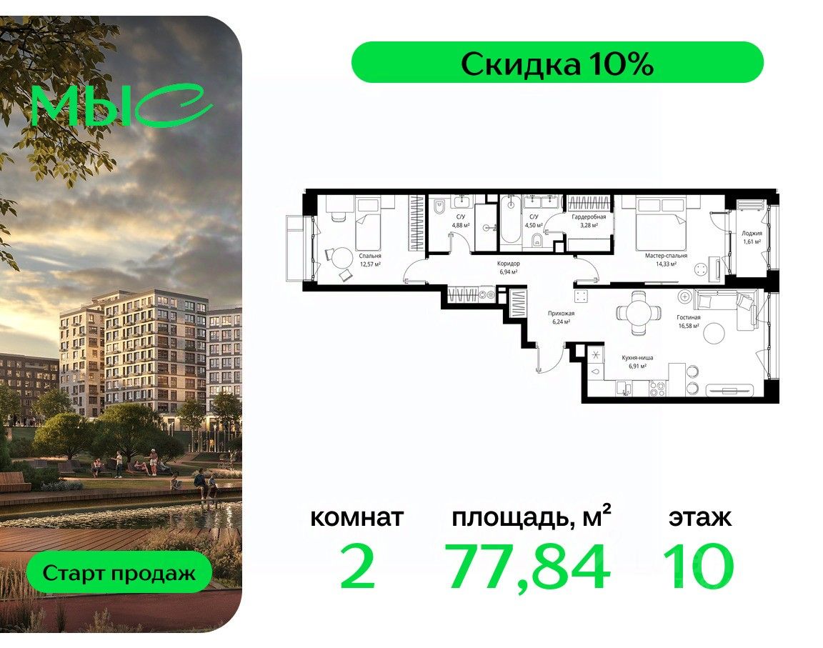 Продаётся 2-комнатная квартира общей площадью 77.84 м² без отделки в премиальном жилом комплексе "МЫС" на 10-м этаже 12 этажного дома. Квартира расположена в корпусе "Сибирь".