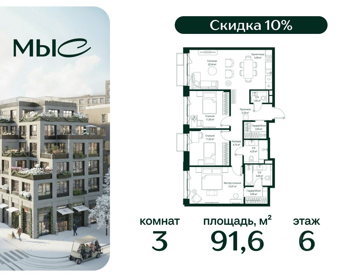 Продаётся 3-комнатная квартира общей площадью 91.55 м² без отделки в премиальном жилом комплексе "МЫС" на 6-м этаже 12 этажного дома. Квартира расположена в корпусе "Сибирь".