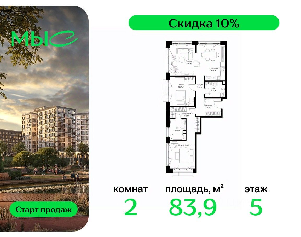 Продаётся 2-комнатная квартира общей площадью 83.90 м² без отделки в премиальном жилом комплексе "МЫС" на 5-м этаже 12 этажного дома. Квартира расположена в корпусе "Сибирь".