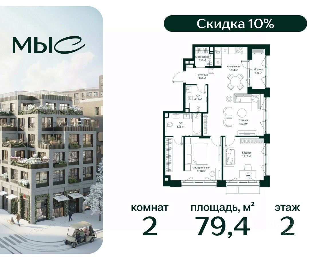 Продаётся 2-комнатная квартира общей площадью 79.36 м² без отделки в премиальном жилом комплексе "МЫС" на 2-м этаже 12 этажного дома. Квартира расположена в корпусе "Сибирь".