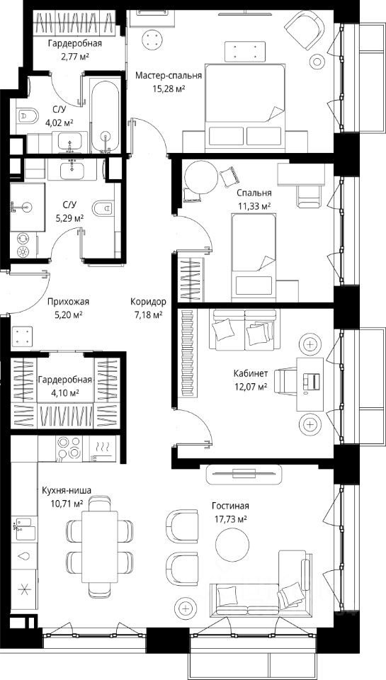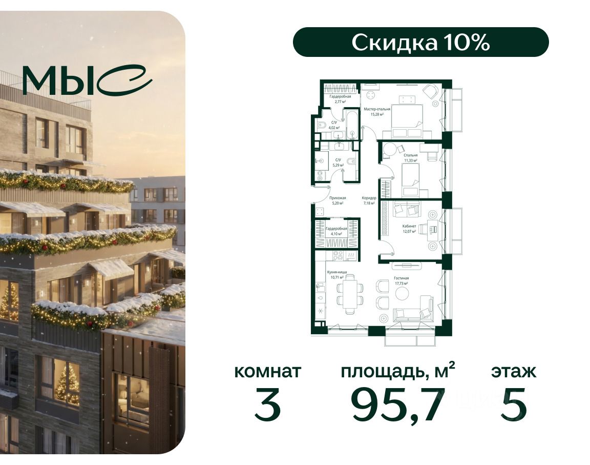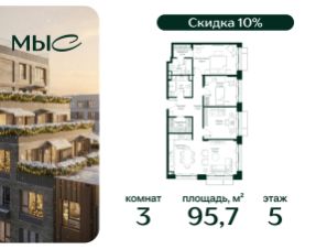 Продаётся 3-комнатная квартира общей площадью 95.68 м² без отделки в премиальном жилом комплексе "МЫС" на 5-м этаже 12 этажного дома. Квартира расположена в корпусе "Сибирь".