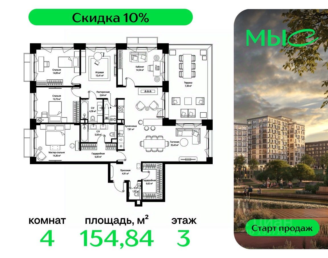 Продаётся 4-к квартира общей площадью 154.84 м² без отделки в премиальном жилом комплексе "МЫС" на 3-м этаже 12 этажного дома. Квартира расположена в корпусе "Сибирь".