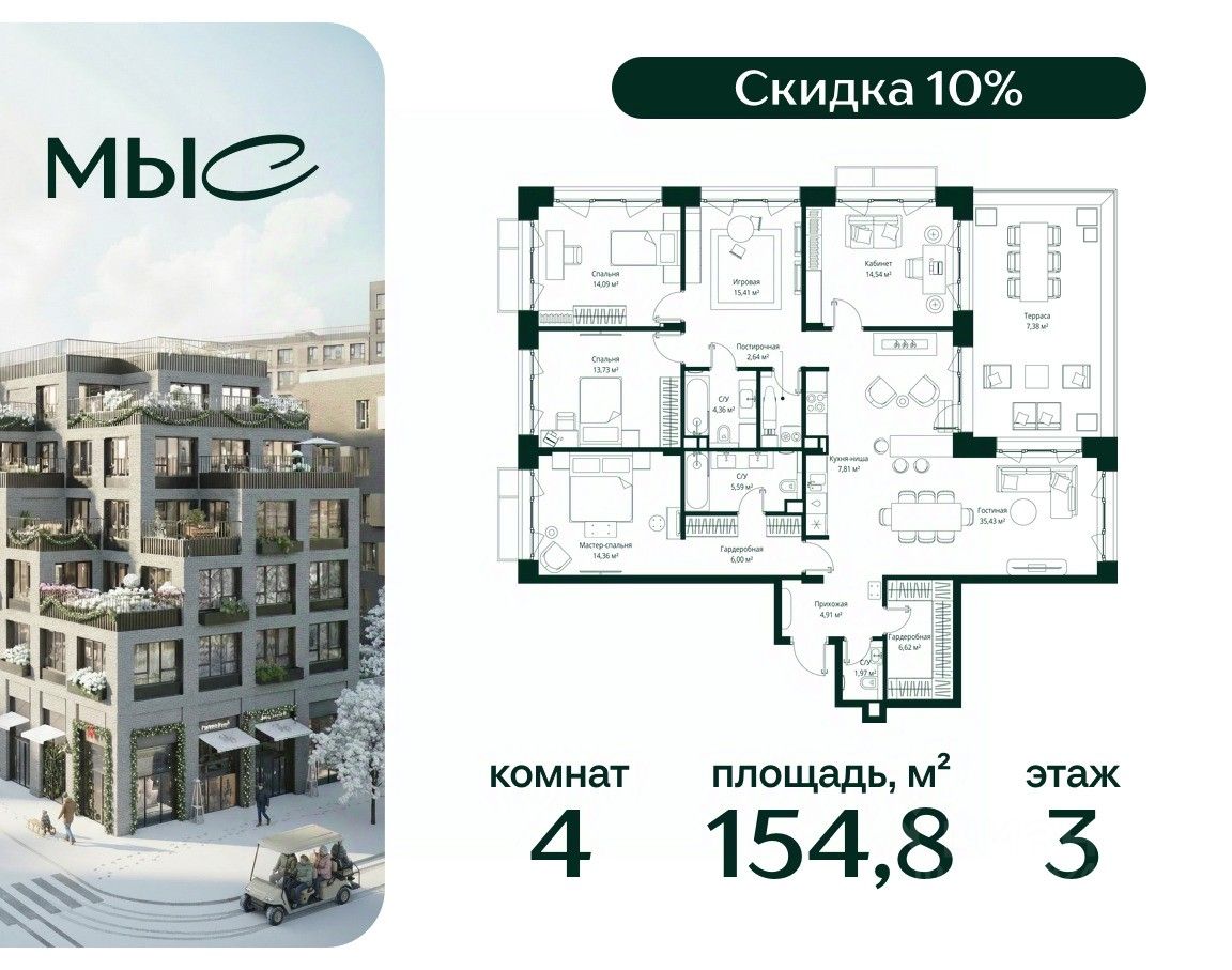 Продаётся 4-комнатная квартира общей площадью 154.84 м² без отделки в премиальном жилом комплексе "МЫС" на 3-м этаже 12 этажного дома. Квартира расположена в корпусе "Сибирь".