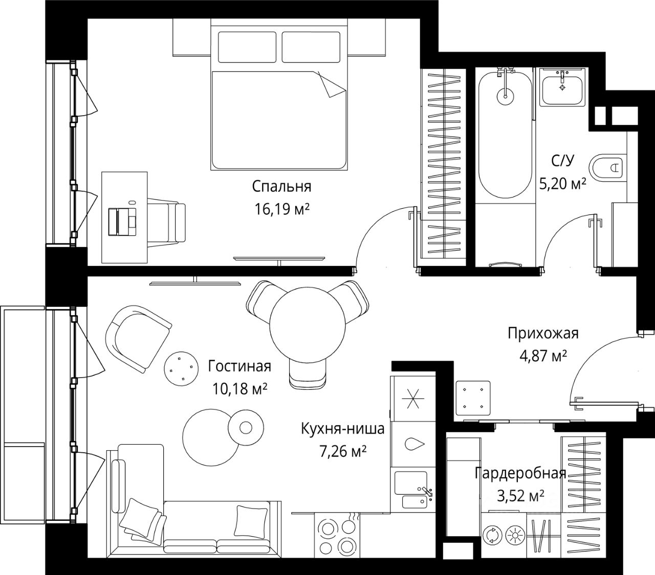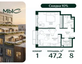Продаётся 1-комнатная квартира общей площадью 47.22 м² без отделки в премиальном жилом комплексе "МЫС" на 8-м этаже 12 этажного дома. Квартира расположена в корпусе "Сибирь".