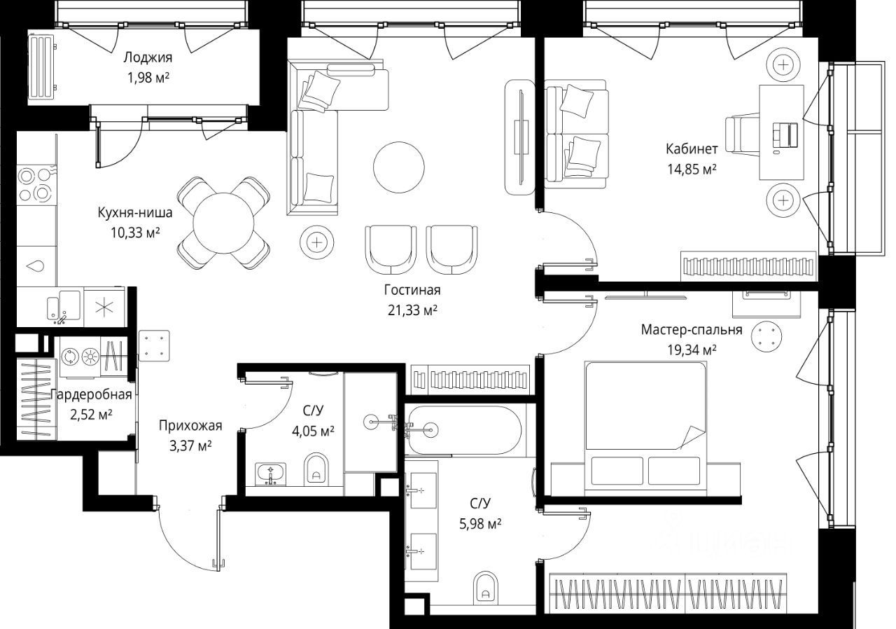 Продаётся 2-комнатная квартира общей площадью 83.75 м² без отделки в премиальном жилом комплексе "МЫС" на 4-м этаже 12 этажного дома. Квартира расположена в корпусе "Сибирь".