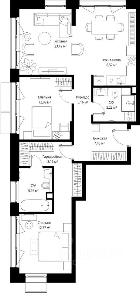 Продаётся 2-комнатная квартира общей площадью 83.96 м² без отделки в премиальном жилом комплексе "МЫС" на 8-м этаже 12 этажного дома. Квартира расположена в корпусе "Сибирь".