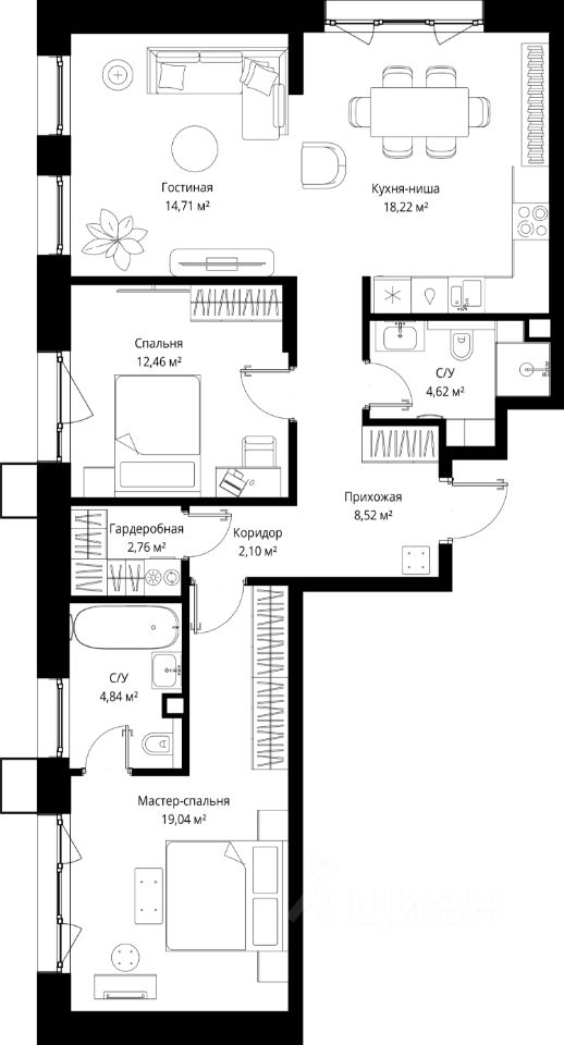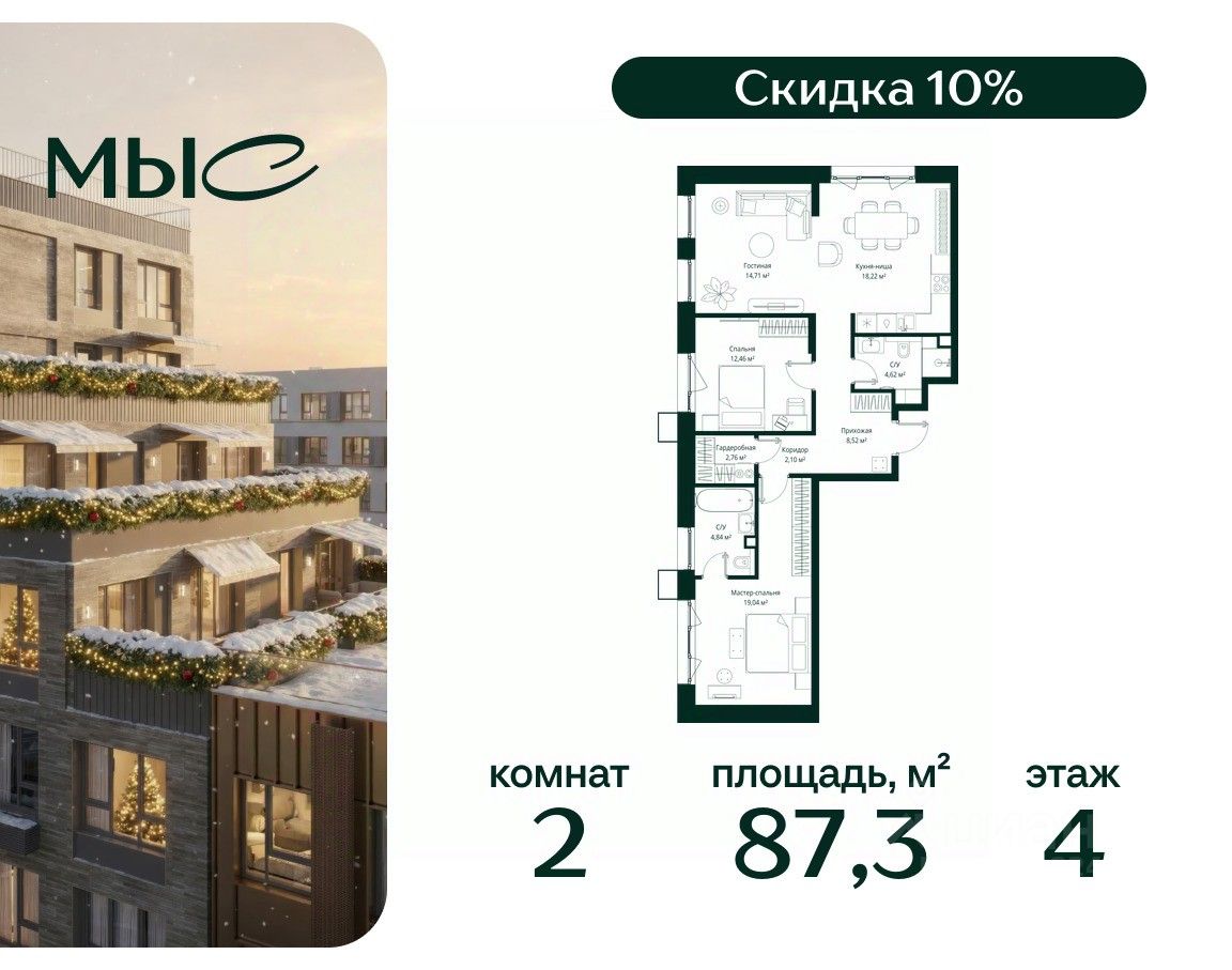 Продаётся 2-комнатная квартира общей площадью 87.27 м² без отделки в премиальном жилом комплексе "МЫС" на 4-м этаже 12 этажного дома. Квартира расположена в корпусе "Сибирь".
