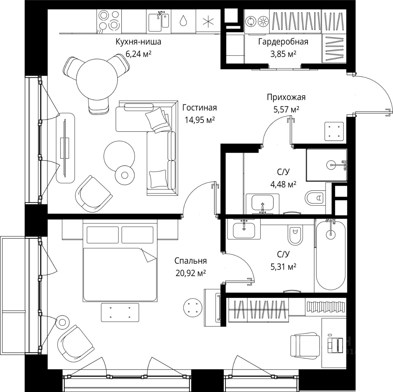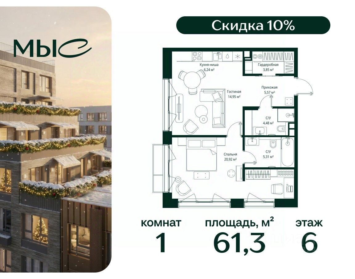 Продаётся 1-комнатная квартира общей площадью 61.32 м² без отделки в премиальном жилом комплексе "МЫС" на 6-м этаже 12 этажного дома. Квартира расположена в корпусе "Сибирь".