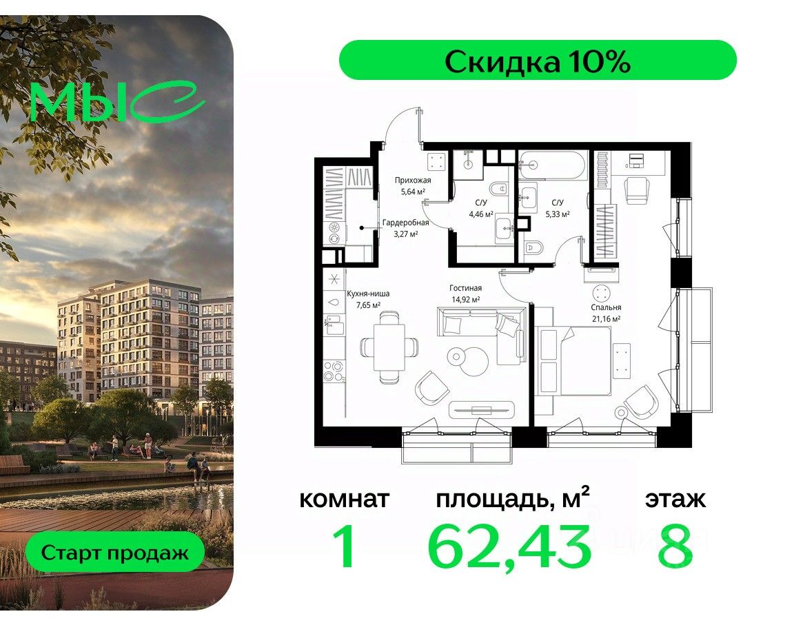 Продаётся 1-комнатная квартира общей площадью 62.43 м² без отделки в премиальном жилом комплексе "МЫС" на 8-м этаже 12 этажного дома. Квартира расположена в корпусе "Сибирь".