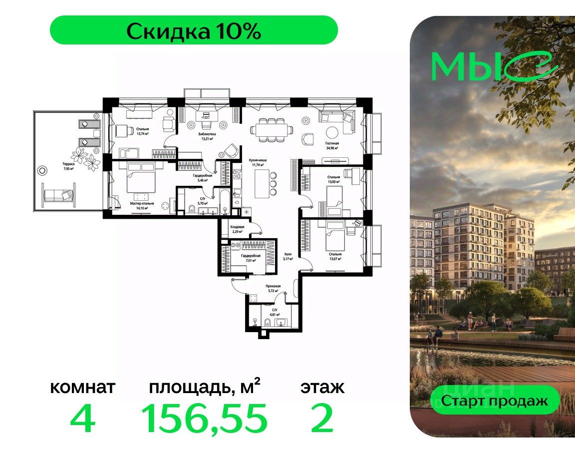 Продаётся 4-к квартира общей площадью 156.55 м² без отделки в премиальном жилом комплексе "МЫС" на 2-м этаже 12 этажного дома. Квартира расположена в корпусе "Сибирь".