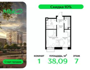 Продаётся 1-комнатная квартира общей площадью 38.09 м² без отделки в премиальном жилом комплексе "МЫС" на 7-м этаже 12 этажного дома. Квартира расположена в корпусе "Сибирь".