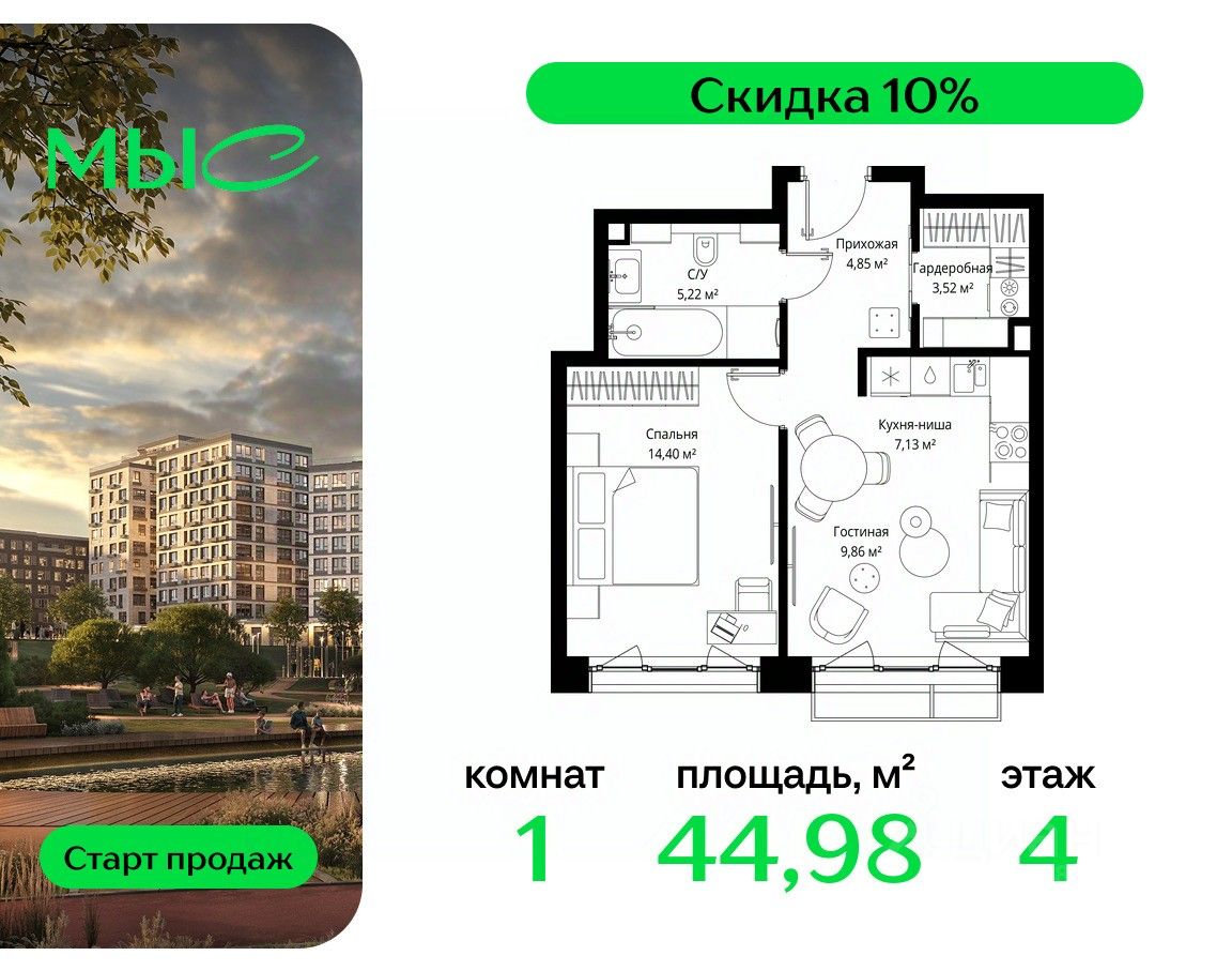 Продаётся 1-комнатная квартира общей площадью 44.98 м² без отделки в премиальном жилом комплексе "МЫС" на 4-м этаже 12 этажного дома. Квартира расположена в корпусе "Сибирь".